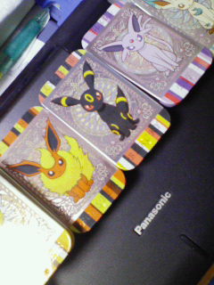 等身大イーブイが5個売ってたけど買うのはやめました(*_*) 荷物になりそうだったから。 今度は買おうカナ… クリアファイル19枚買ったw 1匹ずつのを2枚×8種と全部載ってるのを3枚v キャンバスぬいぐるみは全8種購入w 選ぶの面倒だったからセットで買った☆ プチ缶5個買ったら この前出なかったシャワーズとグレイシア出た(*^□^*) あともぅ一個のシークレットが出ればコンプ!!