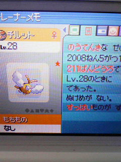 70話の感想から。 もぅかなり前の話だな・・・(苦笑) 第70話「シャンとしてリーシャン!」 リーシャンが3匹。 リーシャンってチリーンの進化前なんだよね。 ゲームやってて途中で知った。最初は知らなかったよ・・・ まさかチリーンに進化前がいるとは・・・ コジロウ、前、チリーン持ってたけど、DPでは持ってなくてどうしたんだろう?って思ってたんだけど… 預けてあるのか・・・なるほど。 チリーンが欲しくなるの分かるよ、コジロウ!!! ヘタレなコジロウが好きだよvv(笑) |